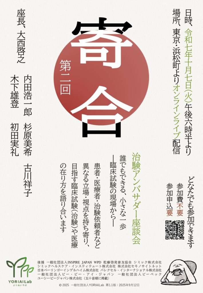 2025年10月7日(火)にYORIAILabの主催で開催される「第2回 治験アンバサダー座談会」に当社の木下雄登がパネルディスカッションに登壇いたします